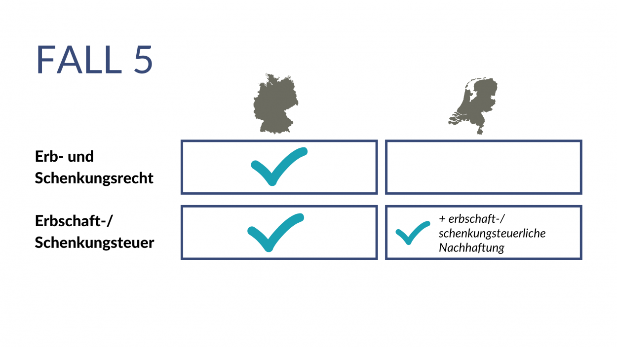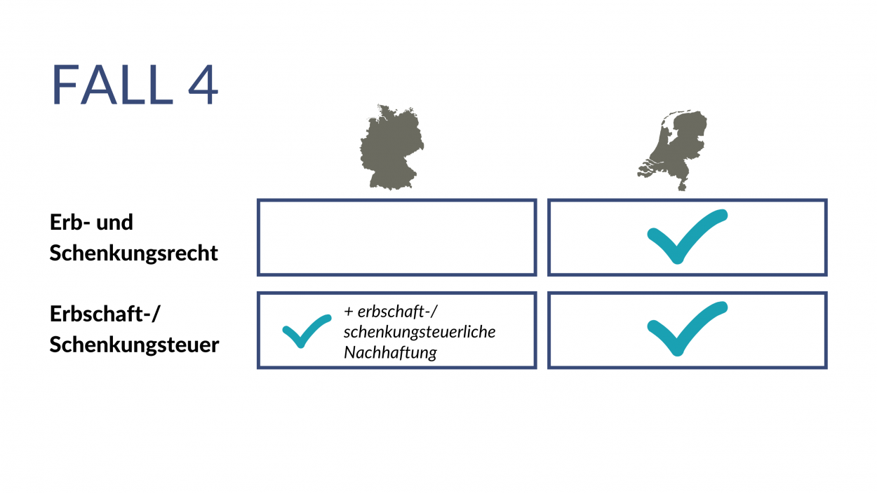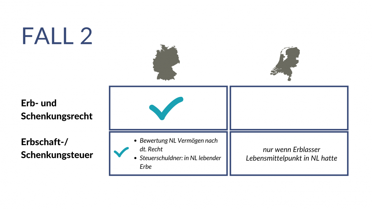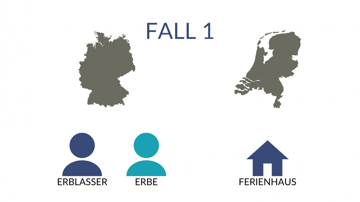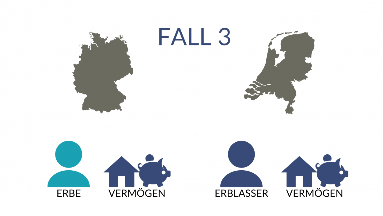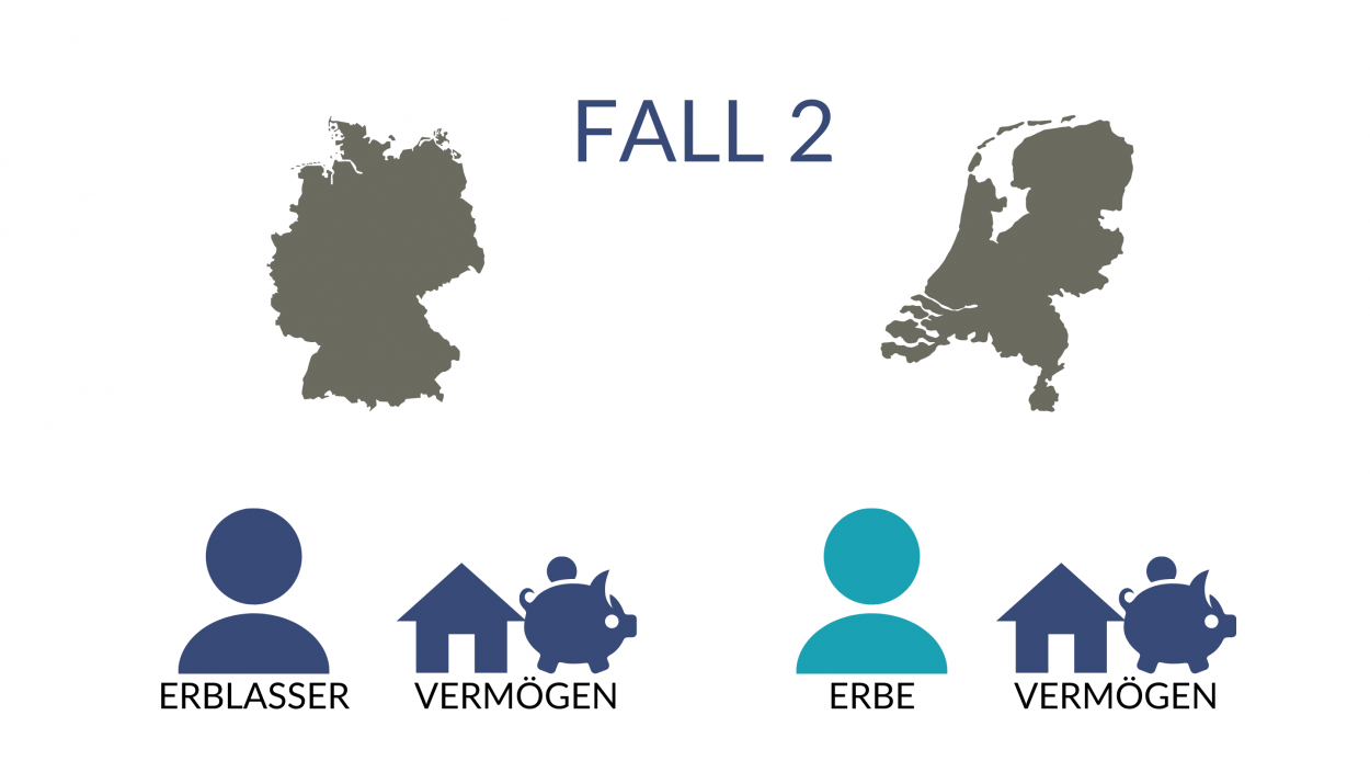 In diesem Fall wohnt der Erblasser in den Niederlanden, der Erbe in Deutschland. Der Erblasser hat wiederum Vermögen in Form von Immobilien und Geldvermögen sowohl in den Niederlanden als auch in Deutschland.