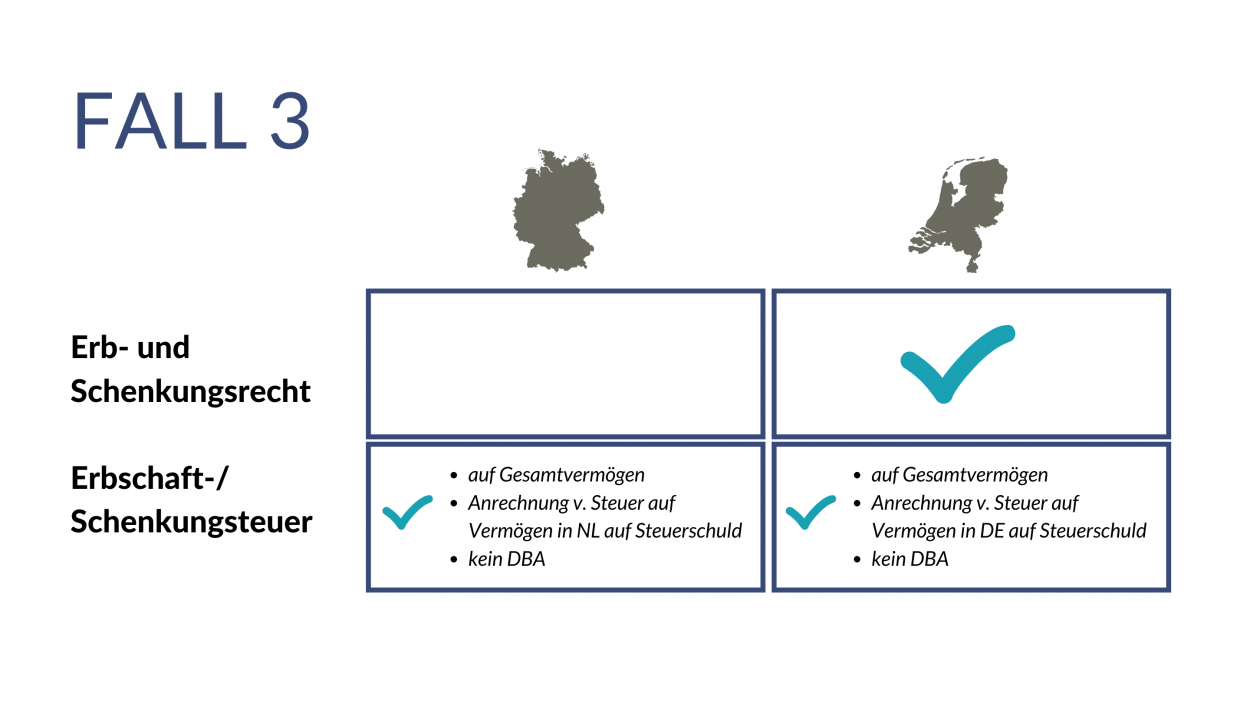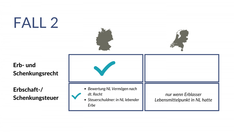 Erbschaftsteuerlich erheben die Niederlande keine Erbschaftsteuer, obwohl der in den Niederlanden lebende Erbe bereichert wird. Das Erbschaftsteuerrecht der Niederlande knüpft nur an Tatbestände an, in denen der vererbende Erblasser seinen Lebensmittelpunkt in den Niederlanden hatte und dies ist hier nicht der Fall. Für den Übergang des in den Niederlanden gelegenen Immobilienvermögens muss der Erbe in den Niederlanden auch keine Grunderwerbsteuer zahlen, da zwar die unentgeltliche Vermögensübertragung unter Lebenden, nicht aber der Anfall von Immobilienvermögen im Wege des Erbgangs unter Grunderwerbsteuer gestellt ist. Die Bewertung des vererbten Vermögens erfolgt nach deutschem Recht. Dies gilt auch für die in den Niederlanden gelegenen Vermögensgegenstände. Steuerschuldner der deutschen Erbschaftsteuer ist der in den Niederlanden wohnende Erbe.