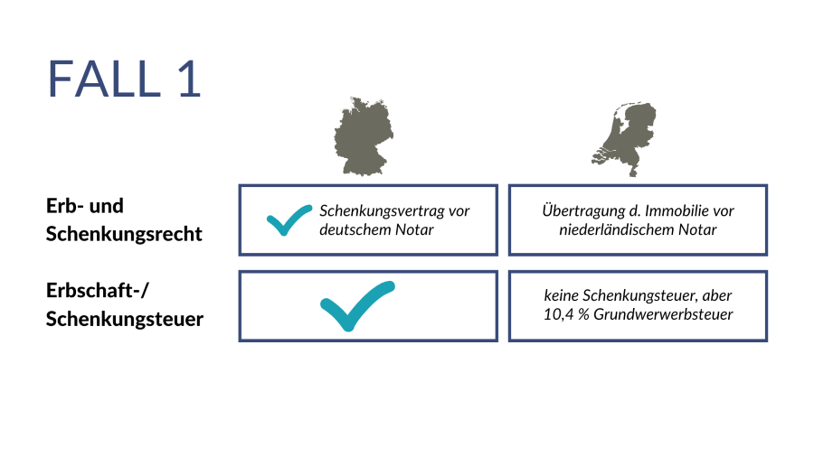 Da der Erblasser seinen Lebensmittelpunkt in Deutschland hat, kommt nach der Rom-IV-Verordnung deutsches Schenkungsrecht zur Anwendung. Dieses bestimmt, dass der Schenkungsvertrag der notariellen Form bedarf. Zwar würde der Mangel der Form, also das Ausbleiben des notariellen Schenkungsversprechens, später durch die Übertragung in den Niederlanden geheilt, aber da die Schenkung jedoch unter Auflagen und Bedingungen stattfinden soll, würde die Heilung diese Auflagen und Bedingungen nicht erfassen.